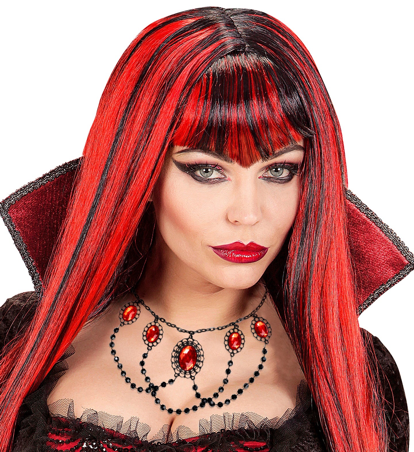 Complete your outfit with this black choker with 5 red stones. Perfect for a mysterious look! Features Stylish black choker... Read more