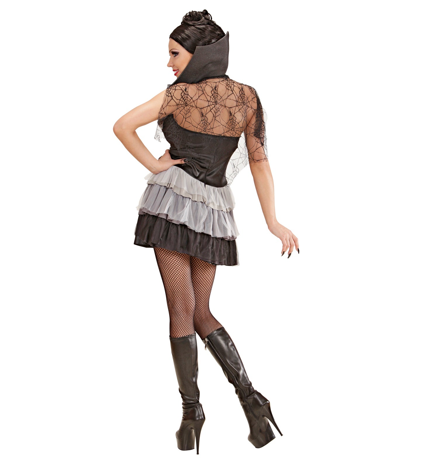 Bestaat uit: dress with stand-up collar and attached spider web headdress, necklace with medallion