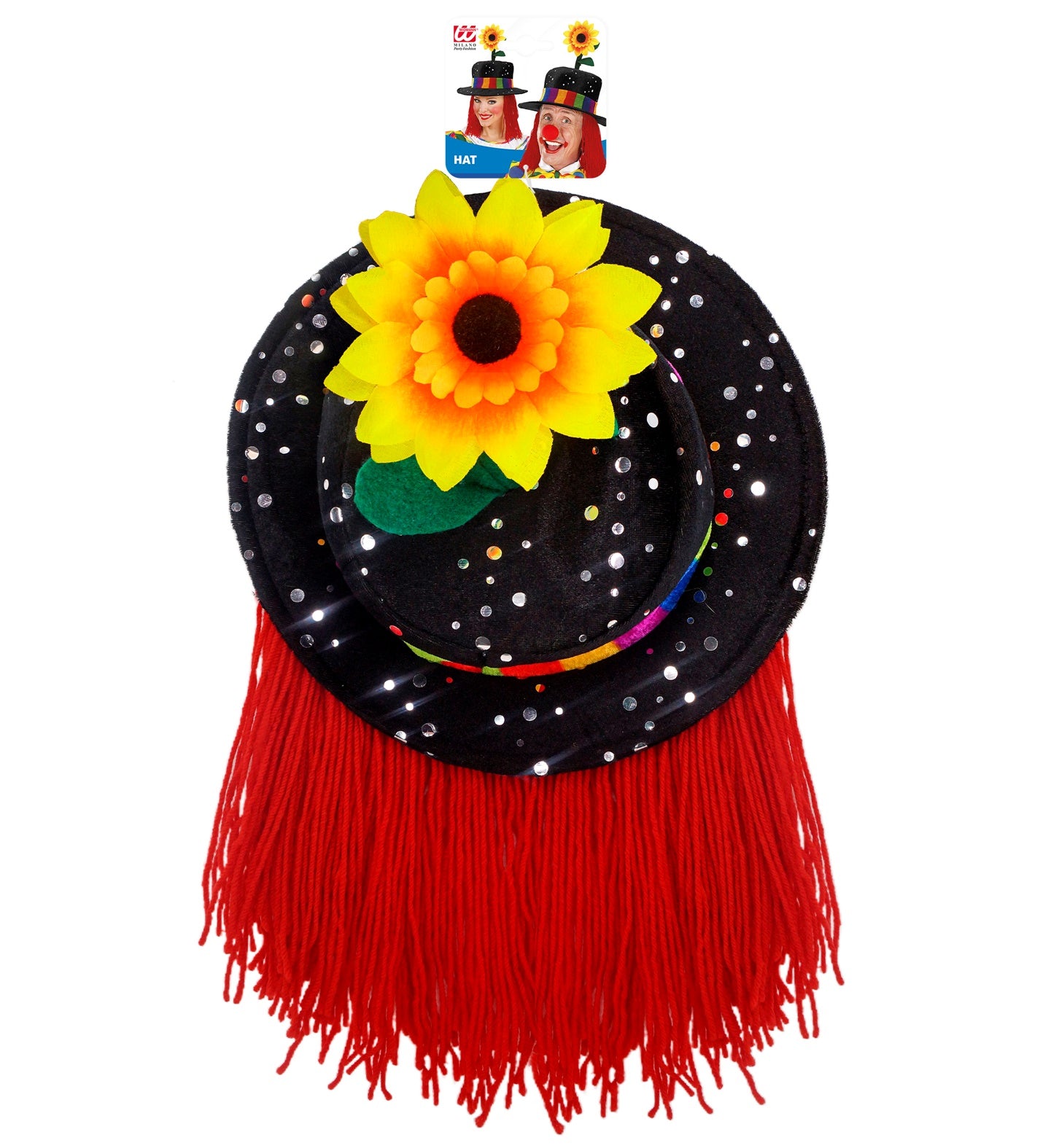 Black felt clown hat with hair and sunflower. Read more