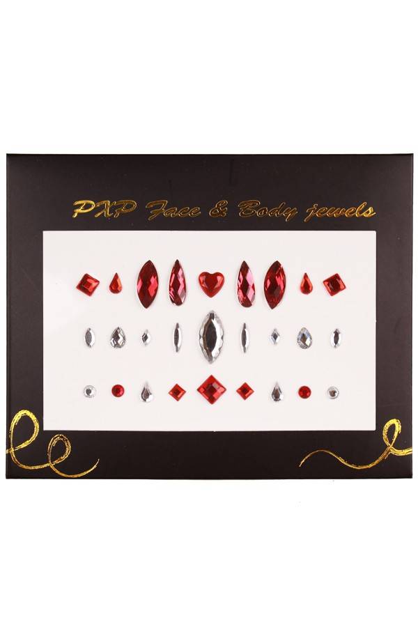 Nice adhesive jewelry in red and silver colors for face and body Read more